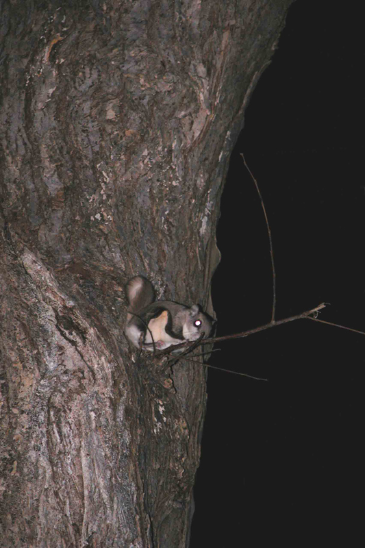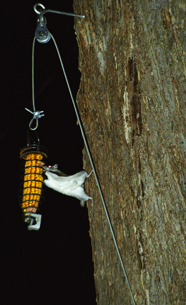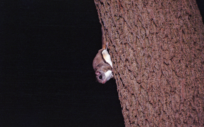 Flying Squirrels don't actually fly, but glide on 'patagium', flaps of skin that extend between the front and back legs. They control their flight using mostly their 'wrists' to control the taughtness of the patagium. In this view you can see the dark line that is formed by the folding of the patagium. Their tails are also somewhat flat and assist in steering and gliding. The single most impressive act is to see one go from a fast glide to a fast brake. When they 'brake' they usually go into a slight upward 'swoop' to land smoothly on a tree.
